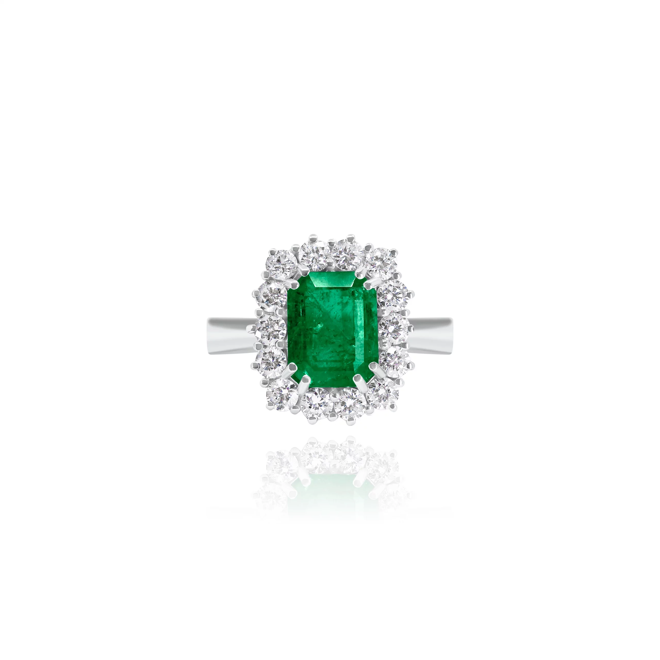 Anello con Smeraldo Ottagonale e Diamanti in oro bianco 18 kt, disponibile in diverse carature.