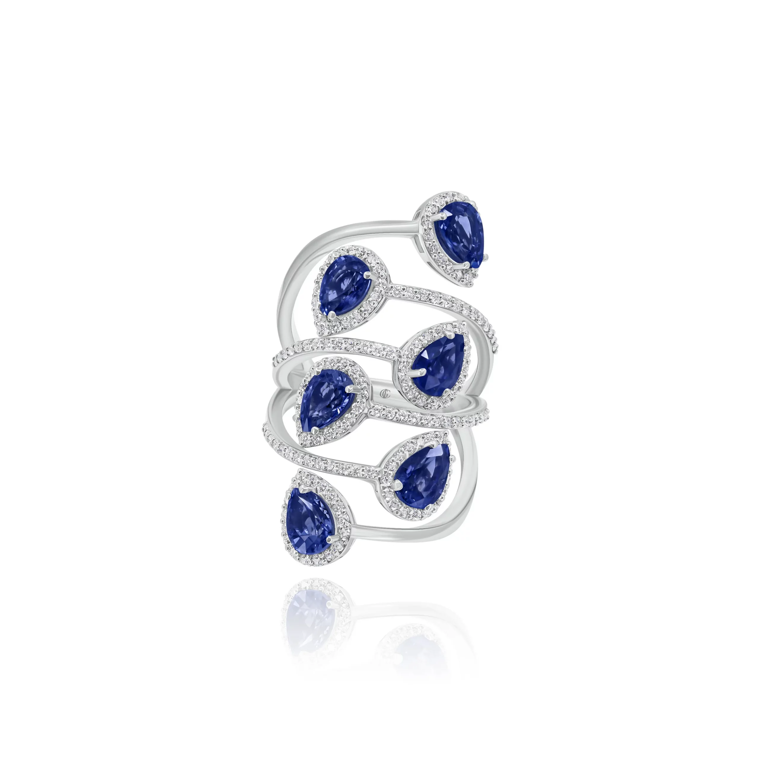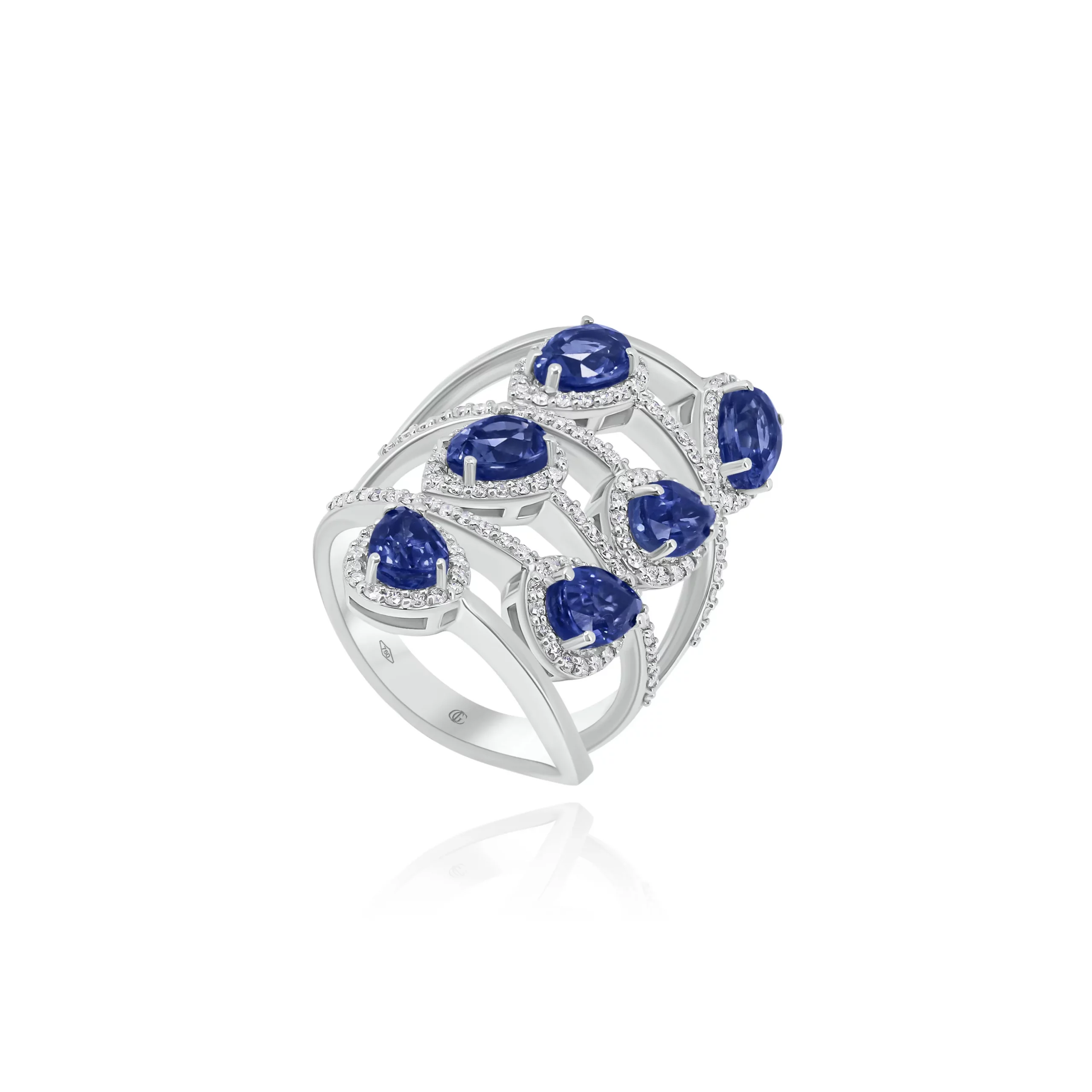 Anello con Zaffiri taglio Goccia e Diamanti in oro bianco 18 kt:
